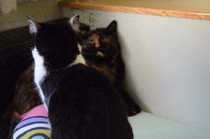 Takle mamo. Dve totalno različno mački. Po fizionomiji in karakterno. Verjetno nikoli ne bosta spali skupaj, ker je pač Luna tako stroga. Sta pa skupaj, skočita v banjo in čakata, da odprem vodo, pa potem pijeta. Pa sedita na okenski polici, če ima Luna dober dan, : ) Včasih celo kaže na neko prijateljstvo. Potem pa naša Luna potegne zavoro in spet pove, kaj se sme in kaj ne.
