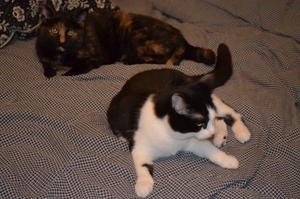 Vse ji je všeč, nove igrače, dekce, hrana. Ona je z vsem zadovoljna. Hodi, skače, prede, mijavka. Res, pravi mali gumbek... In ta gumbek je še precej brihten. Skoči pred Luno in vzame igračo in se lepo mirno igra, tako da se ona umakne. Vzame hrano. Tudi pred Luno. Tako da moram malo pazit, ker gre naši starejši dami tudi to rahlo na živce, da ne bi prišlo do obračunavanj.